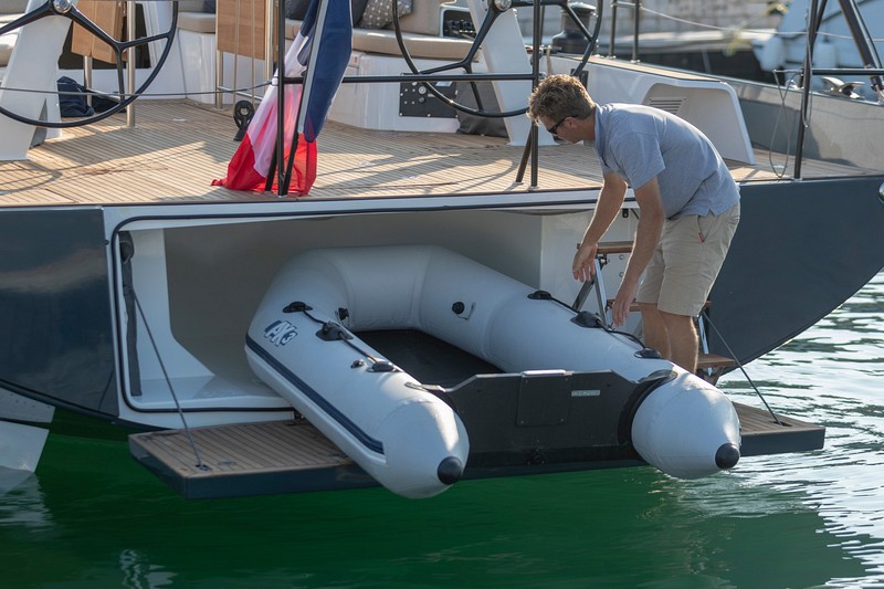 Koupací plošina na zádi je ovládána elektricky. Uvnitř garáže je schovaná sprcha. V garáži je místo na nafouknutý člun 240 cm dlouhý a na částečně vypuštěný délky 270 cm.