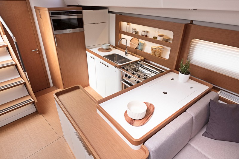 Inovace najdeme i v podpalubí jachty. Loděnice Beneteau má vždy velmi dobře přečtené své zákazníky. Proto si může dovolit řešení, která se mnohým mohou zdát nevhodná. Majitel jachty za půl milionu EUR (v základu a bez DPH) má jiné priority než běžný charterový jachtař. Večery tráví v restauracích a pokud jí na lodi, obvykle zvolí kokpit. Proto nenajdete v salonu veliký jídelní stůl, ale jen malý kávový stolek a rozkládací stolek pro čtyři na levoboku před kuchyní.