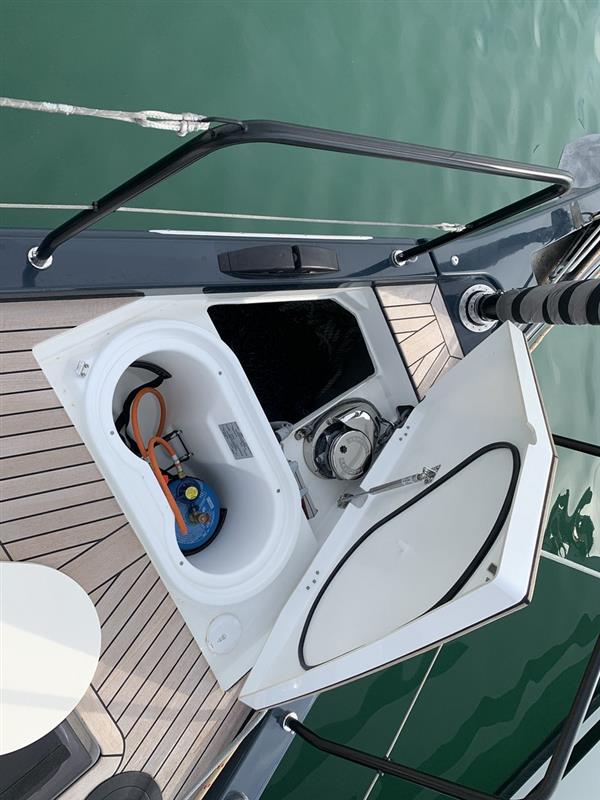 Pod luknou na přídi najdete sklad plachet, fendrů a dalších nezbytností. Jsou zde použity plastové přepravky na drobné potřebnosti, které jsou proti vypadnutí zajištěny nerezovým kováním.